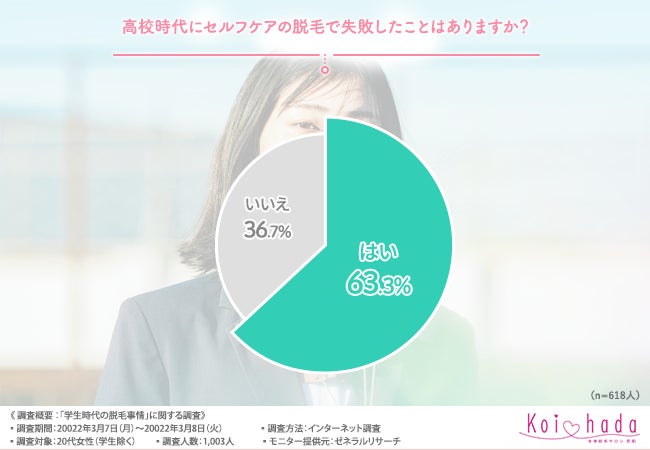 そこで、「高校時代にセルフケアの脱毛で失敗したことはありますか?」と質問したところ、6割以上の方が『はい(63.3%)』と回答しました。