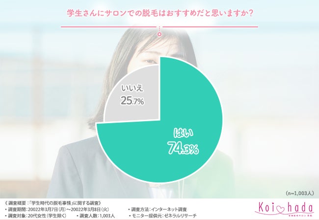 そこで、「学生さんにサロンでの脱毛はおすすめだと思いますか?」と質問したところ、7割以上の方が『はい(74.3%)』と回答しました。