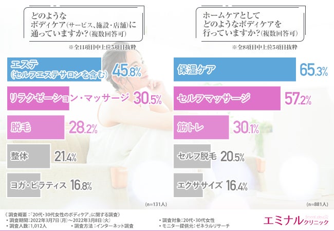 そこで今回、医療ハイフサービス(https://eminal-clinic.jp/hifu/?refmedia=41073)を提供する医療脱毛のエミナルクリニック(https://eminal-clinic.jp/)は、20代・30代女性を対象に、「20代・30代女性のボディケア」に関する調査を実施しました。