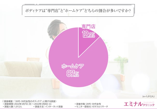 そこで、「ボディケアは“専門店”と“ホームケア”どちらの割合が多いですか?」と質問したところ、『専門店(12.9%)』『ホームケア(87.1%)』と回答しました。