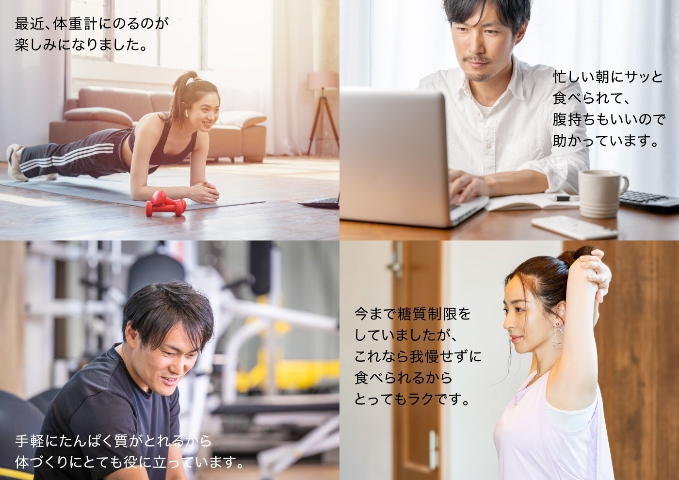 バランスの取れた栄養とトレーニングで理想のカラダをつくりたい方、糖質制限をしているけどしっかり栄養を摂りたい方、ダイエットをしているが食べることを我慢したくない方など、多くのユーザー様から「低糖質にもかかわらず、カラダづくりに必要な栄養素をしっかり摂れる」と高い評価を得ています。