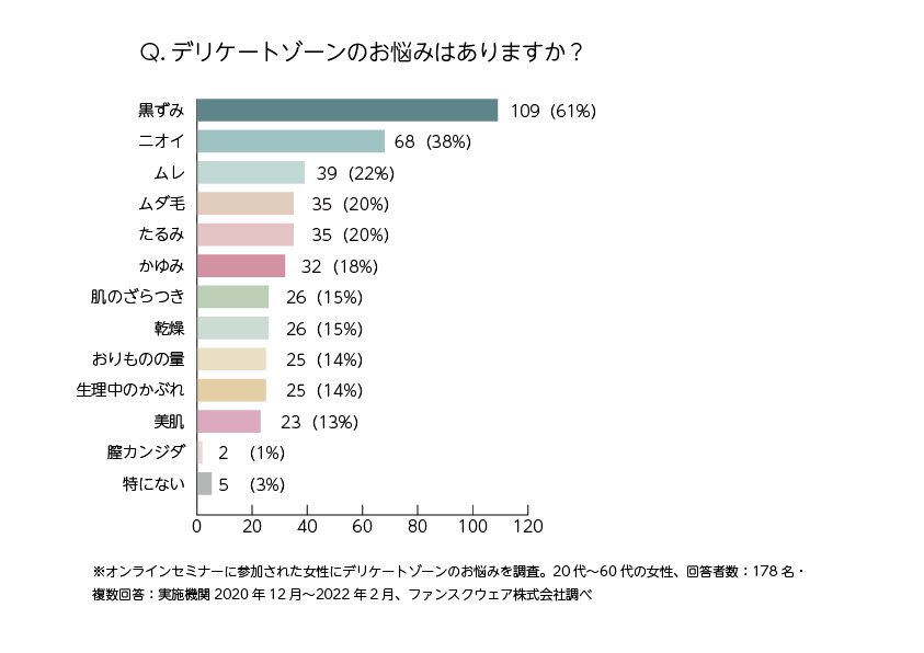 デリケートゾーンケアのオンラインサロン「フェムケアで女性特有の悩みを解決する会」に参加された女性にデリケートゾーンのお悩みを調査し公表しました。 (※2020年12月〜20222月、ファンスクウェア開催のオンラインセミナーに参加いただいた女性178名のアンケート)