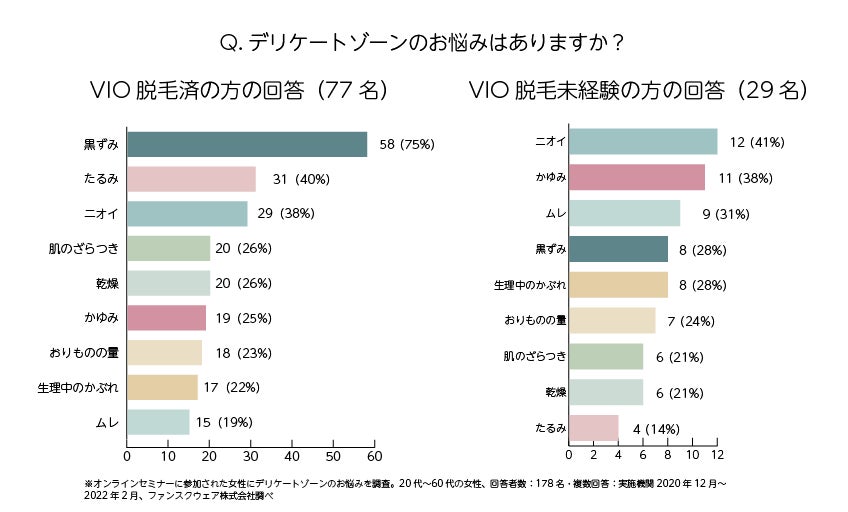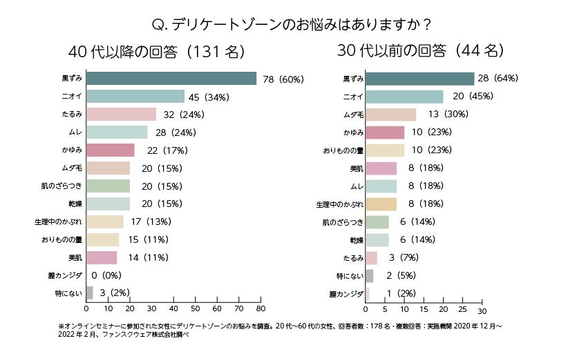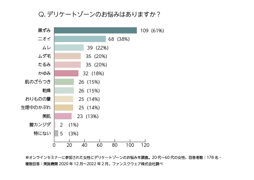 ※オンラインセミナーに参加された女性にデリケートゾーンのお悩みを調査、20代〜60代の女性、回答者数178名・複数回答、実施期間2020年12月〜2022年2月、ファンスクウェア株式会社調べ