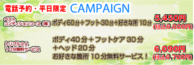 ボディケア40分+フットケア30分+ヘッドケア 20分+お好きな所10分無料サービス! 税込 6700円