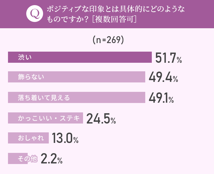 アンケートの結果は、1位「渋い」、2位「飾らない」、3位「落ち着いて見える」となりました。