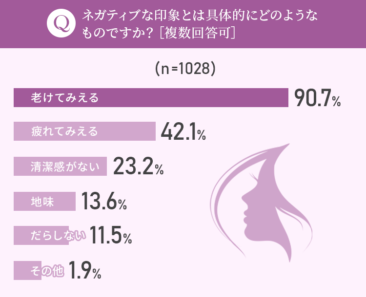 複数回答可としていますが、90.7%と大半の方が「老けてみえる」と回答しました。
