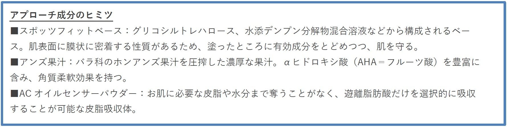 有効成分を早くニキビができやすい部位に送り込むため、ピタッと密着する効果のあるスポッツフィットベースを採用。有効成分をニキビができやすい部分に集中的にとどめ、より早く効果を発揮できるようにします。
