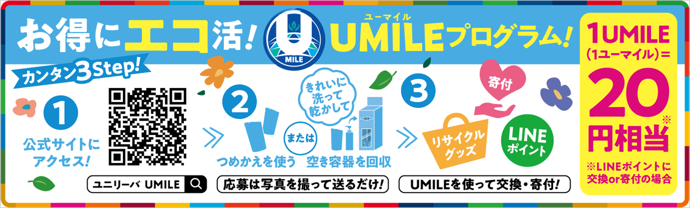 UMILEプログラムは、毎日の暮らしの中で、お得に、楽しく「プラスチックは資源」が“あたりまえ”になる未来に向けたアクションをとれるプログラムです。このプログラムでは、ボトル製品に比べてプラスチックの使用量が約70~90%減らせるユニリーバのつめかえ製品を「買ってためる」、ご家庭で使用後に洗浄・乾燥した空のプラスチック容器をパートナー店舗の回収ボックスに入れて「リサイクルしてためる」の2つの方法で、「UMILE(ユーマイル)」というポイントをためられます。ためたUMILEは、LINEポイントに交換したり、子どもたちのために活動している団体に寄付できます(1UMILE=20LINEポイントまたは20円の寄付)。