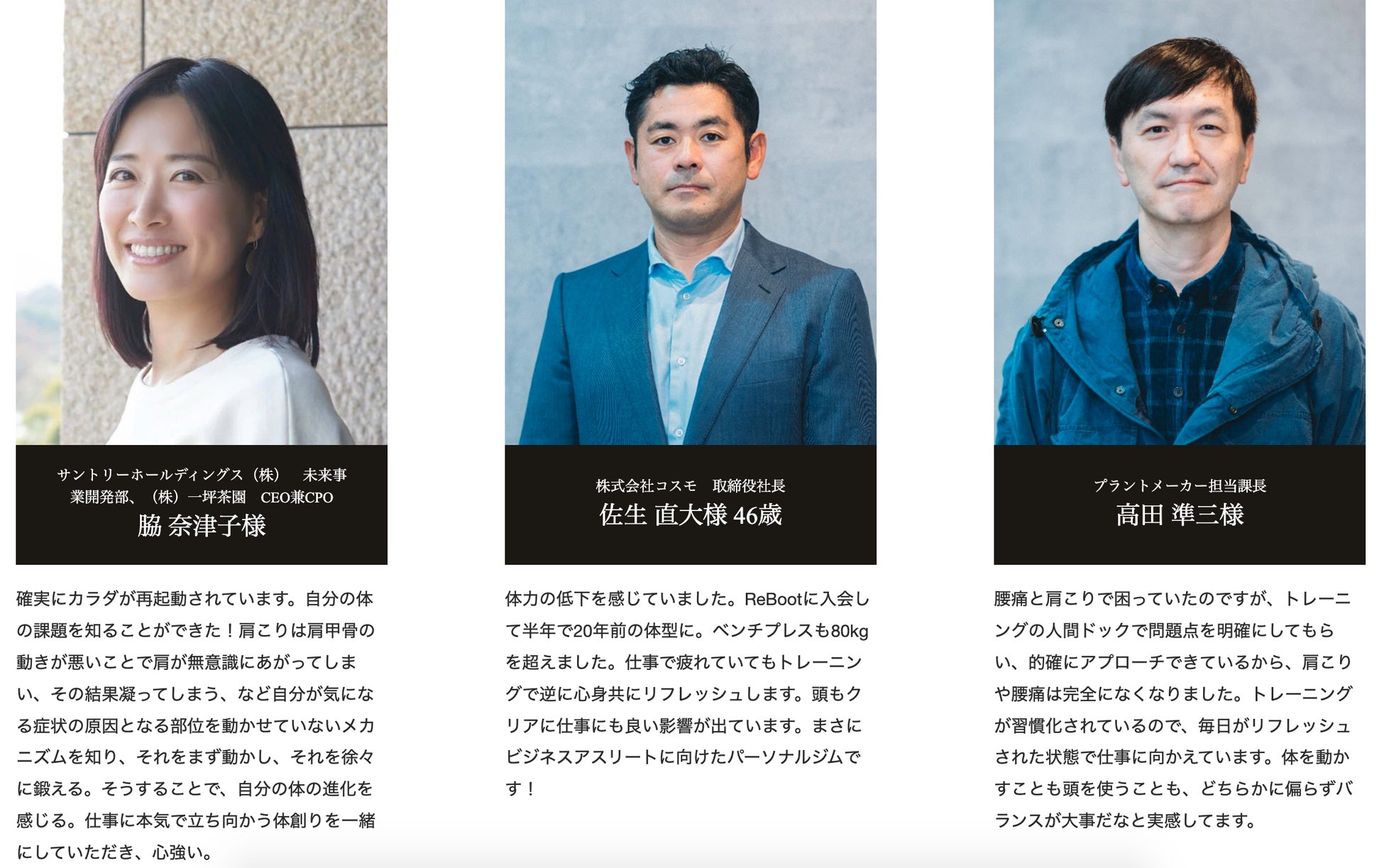 CA社の藤田社長はじめ、多くの経営者、ビジネスマンが通い続けるパーソナルジムReBootには大きく分けて3つの特徴があります。