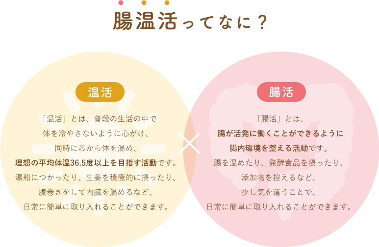 理想の平均体温 36.5 度以上を維持する「温活」と 腸を整える「腸活」を掛け合わせ、それぞれ の効果を高め合いながら体質改善につなげるハイブリッドルーティンです。