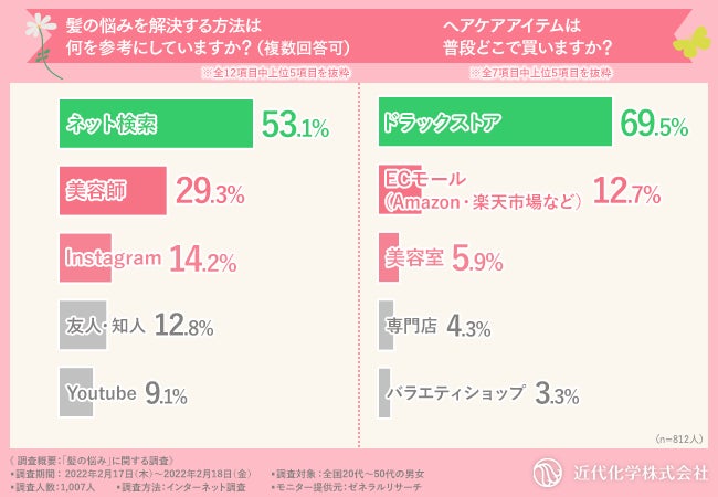 「髪の悩みを解決する方法は何を参考にしていますか?(複数回答可)」と質問したところ、『ネット検索(53.1%)』と回答した方が最も多く、次いで『美容師(29.3%)』『Instagram(14.2%)』と続きました。