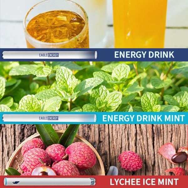 店舗で取扱いのあるフレーバーは3種。人気No1のエナジードリンク、優しいミントと合わせたエナジードリンクミント、フルーティーな甘みと強めのミントがマッチしたライチアイスミントをご用意しています。