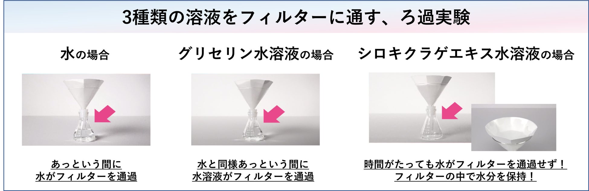 実際に、シロキクラゲエキス水溶液をフィルターに通すろ過実験において、水、グリセリン水溶液※5 と比較したところ、水やグリセリン水溶液があっという間にフィルターを通過してしまうのに対し、シロキクラゲエキス水溶液は、多くの水を抱きかかえることによって膨潤し、時間がたってもフィルターを通過せず、高い水分保持力があることを確認することができました。