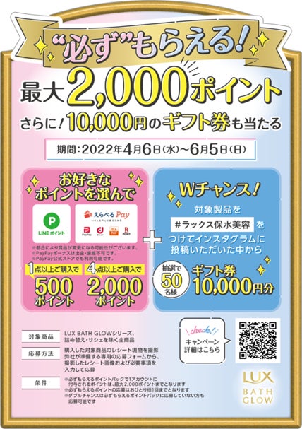 4 月 6 日(水)より期間限定で、応募すると必ずもらえるキャンペーンを開始します。期間中対象商品ご購入し応募すると、最大2,000 ポイントがもらえる他、インスタグラムにて#ラックス保水美容をつけて対象商品を投稿すると、抽選で50名様にギフト券 10,000 円分が当たるチャンスもご用意しました。 奮ってご応募ください。