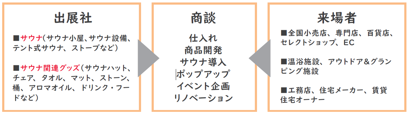サウナ設備とサウナグッズを取り扱う企業が一堂に出展し、全国小売店や温浴・アウトドア施設、工務店・住宅メーカーなど、様々な業種の来場者と商談できる展示会です。貴社のビジネス拡大のために、ぜひご出展ください。