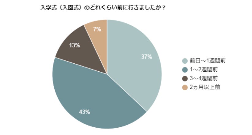 一番多かった回答は、「1〜2週間前」で43%と半数近くの数字です。次に多かったのは、「前日〜1週間前」でした。この結果からわかるように、約8割の人は入学式(入園式)に近くなってから美容院に行っているということがわかります。