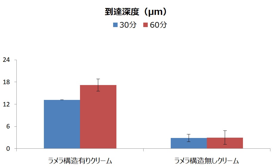 ①有効成分「ナイアシンアミド(醗酵)」を同量含むクリーム製剤において、ラメラ構造の有無処方をそれぞれヒト前腕内側部に塗布。30/60分後で到達深度を評価。