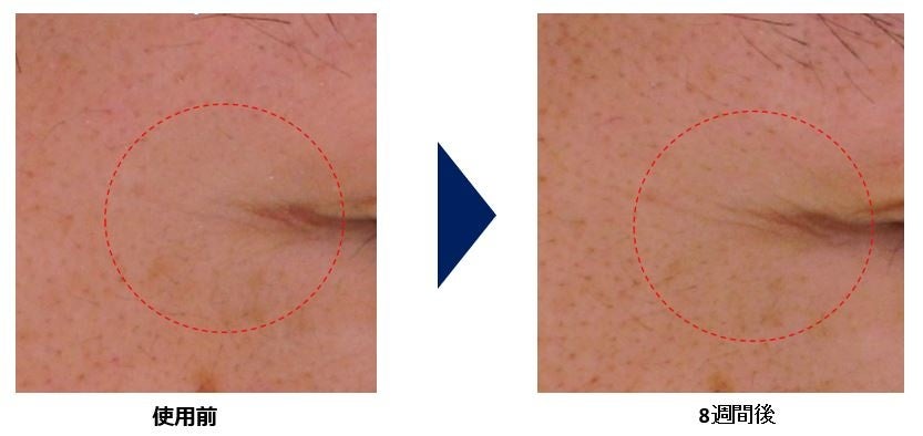②有効成分「ナイアシンアミド(醗酵)」を同量含むクリーム製剤において、ラメラ構造有無処方を半顔使用し、8週間後の状態を比較。