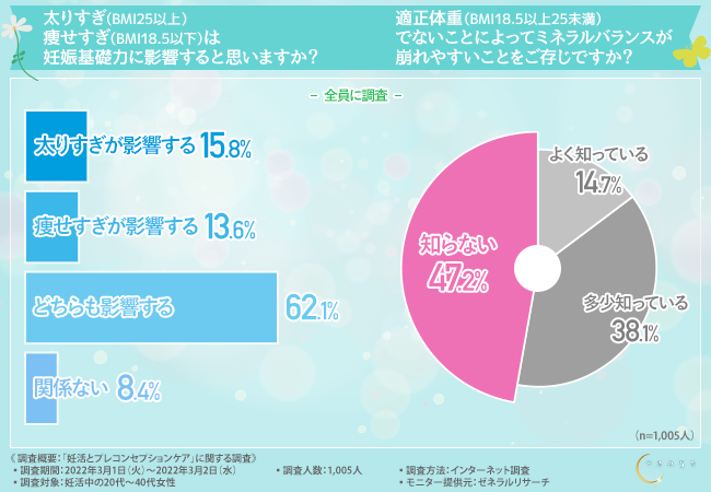 しかし、太りすぎや痩せすぎが妊娠基礎力に影響すると考える方が9割以上いる一方、その理由であるミネラルバランスと妊娠基礎力との関係についてはあまり認識されていませんでした。