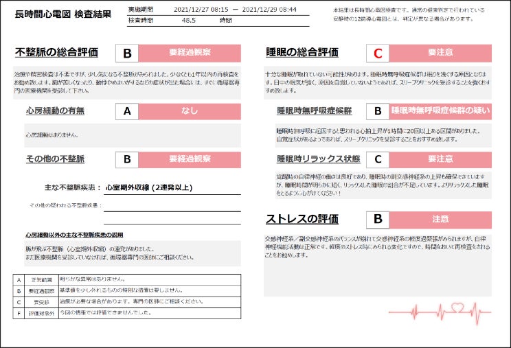 弊社のサービス「kokoromil」は20を超える大学病院で導入されており、安全性・信頼性の高い医療機器(心電計)を使用して心電図を取得・解析します。そして、不整脈は元より、自律神経解析からストレスと睡眠の質を可視化し、睡眠時無呼吸症候群のスクリーニングも同時に行います。