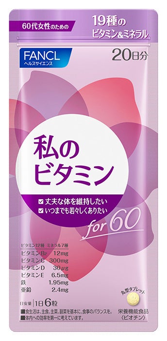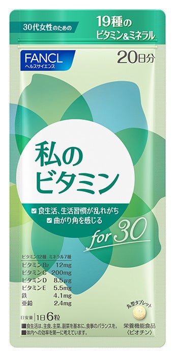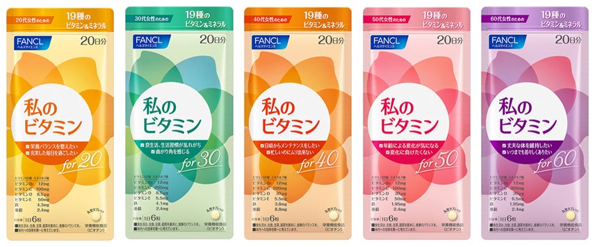 株式会社ファンケルは、4月から全国のドラッグストアを中心に、「私のビタミン」シリーズ(20日分:1,080円<税込>)を新たに発売します。発売するのは、「私のビタミン for 20」から「私のビタミン for 60」までの計5製品です。各年代それぞれの女性に必要な基本栄養素を、これ一つで補えます。毎日の食事にプラスして、手軽に栄養素を摂りたい女性にお勧めです。