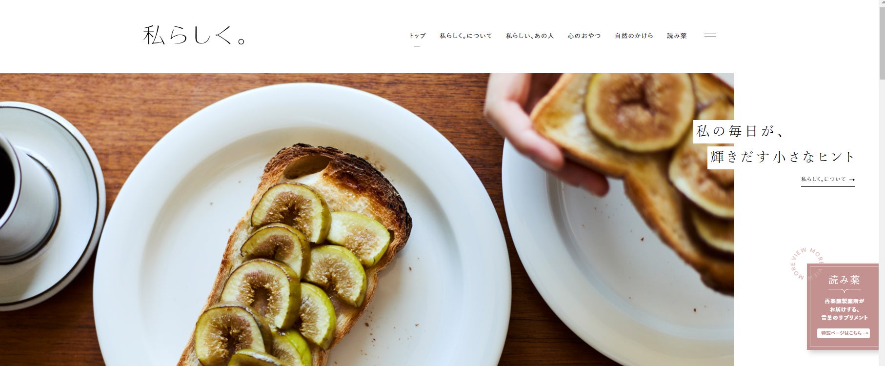 同サイトには、作家・吉本ばななさんの連載「おやつ、みたいなもの」を含む“コラム”などに加え、「自然界の森羅万象と人間は一体」という東洋医学の考え方に根づく、自然と共生するライフスタイルを提案する“Nature”カテゴリなどの「漢方の製薬会社」の流れを汲むコンテンツページも。中でも、“心養生”という漢方のキーワードから派生した、「心が軽やかになることで身体にも良い影響を与える、やさしく、あたたかい言葉の持つ作用は“薬”の効果にも通じるもの」という理念のもとで立ち上げられた、言葉のサプリメントこと“読み薬”ページは、ダイレクトマーケティングという業態から生まれるたくさんの会話を通して「言葉」を大切にしてきた、再春館製薬所ならではのコンテンツです。