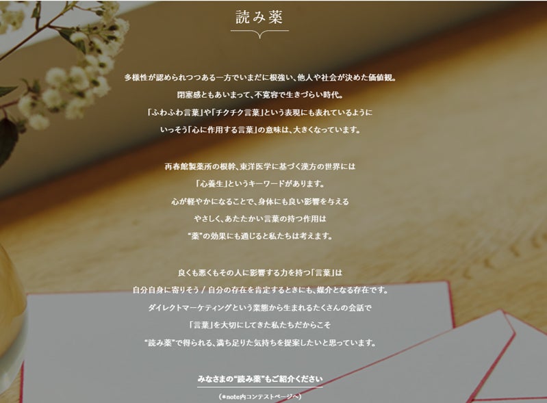 また、同サイトでのコンテンツ“読み薬”に関連し、同日~4月22日(金)で、メディアプラットフォームnoteにて投稿コンテストを開催(https://note.com/info/n/n026b5cc4cf1f)。「#やさしさを感じた言葉」を題材とする作品の募集を開始しています。