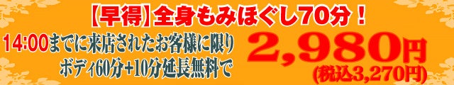 さらに14:00までにご来店頂きましたお客様に限り【早得】としまして10分間長く施術が受けられ料金が通常60分2980円と変わらずとてもお得です!
