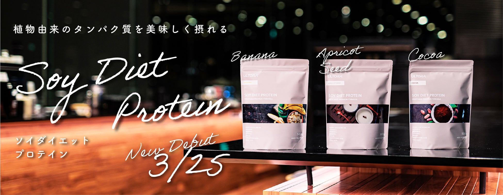 ホエイプロテイン等を展開する株式会社ULTORA(本社:東京都恵比寿、以下弊社)は、公式オンラインストアにて3/25(金)よりソイダイエットプロテイン「バナナ風味」「杏仁風味」「ココア風味」の販売を開始します。(500g税込み価格:¥3,190)