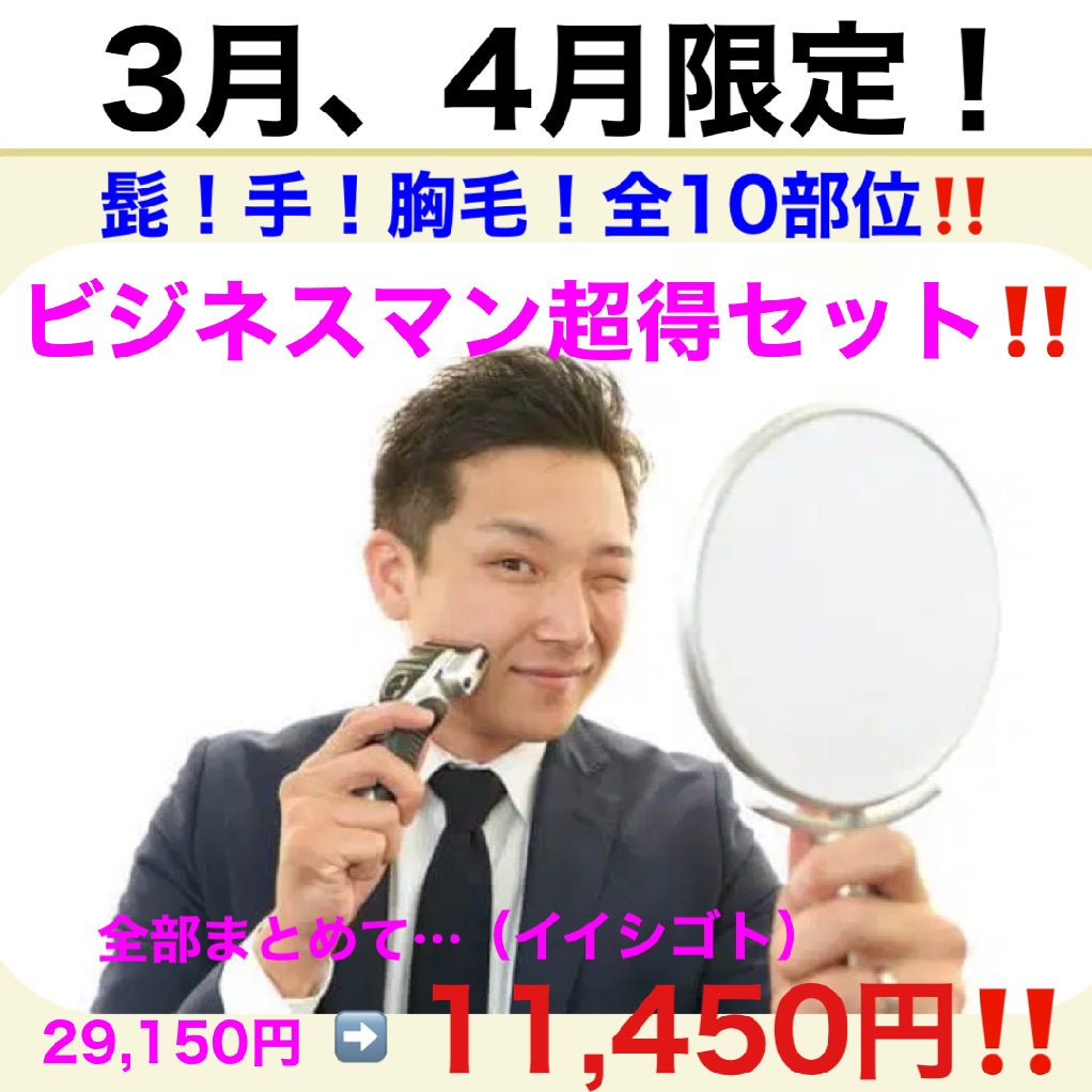 ビジネスマンの第一印象が上がる部位に特化したメニューで、「ほほ、もみあげ、口下、鼻下、あご、首」のフェイス部位と、「胸元」の上半身、「手の指、手の甲」の全10部位をまとめて11450円で受けられます!本来29150円なので17700円もお得!!