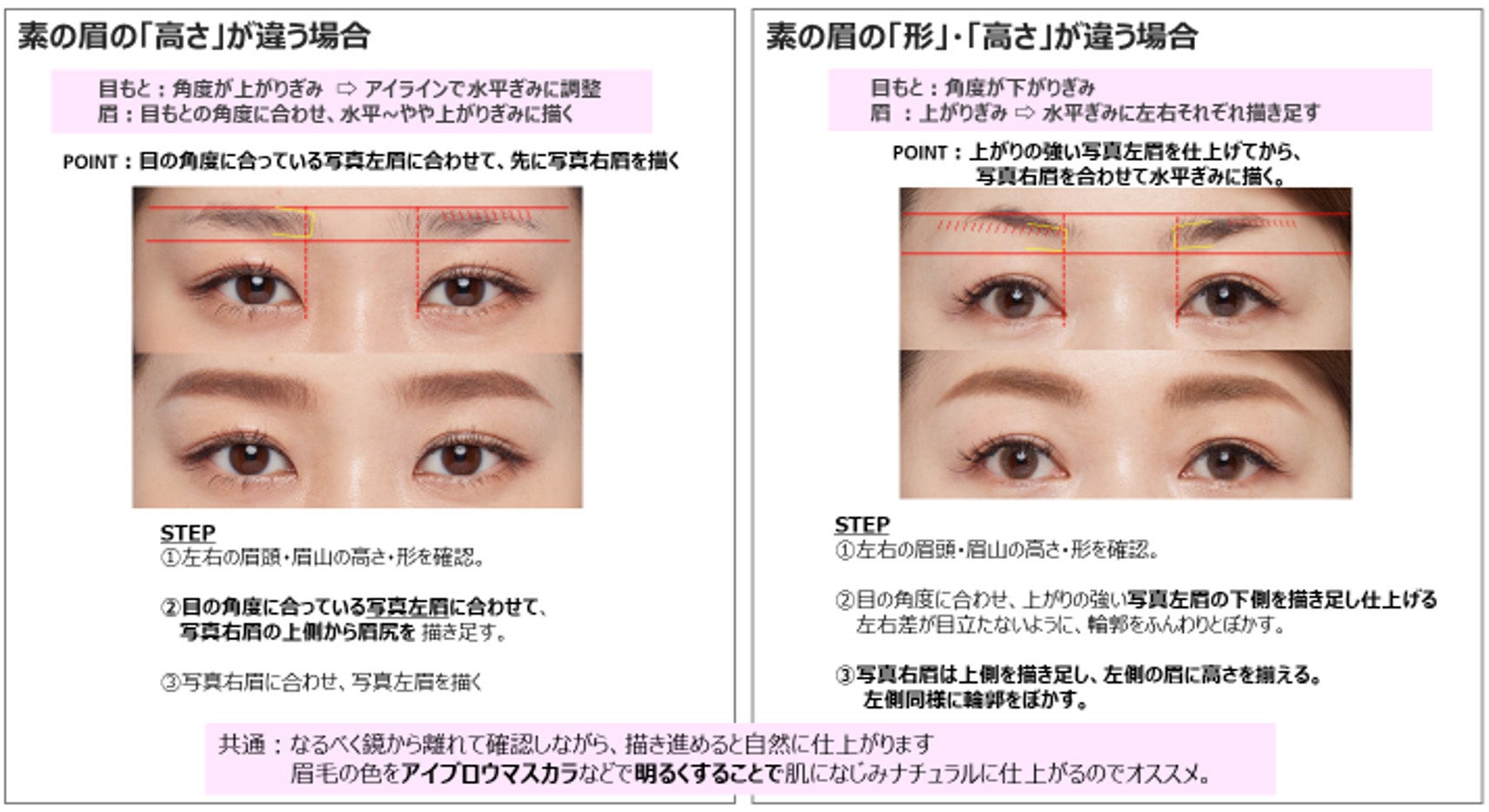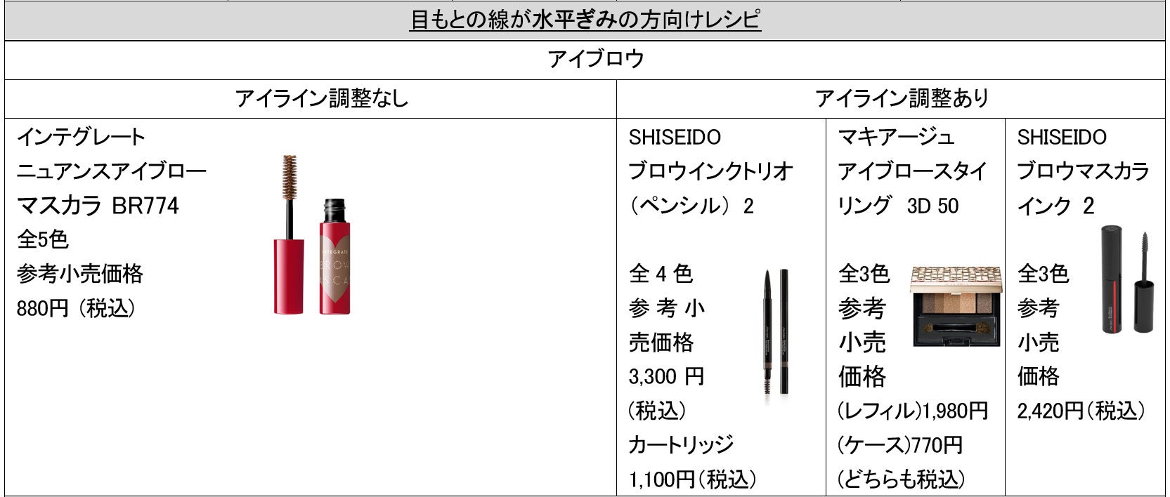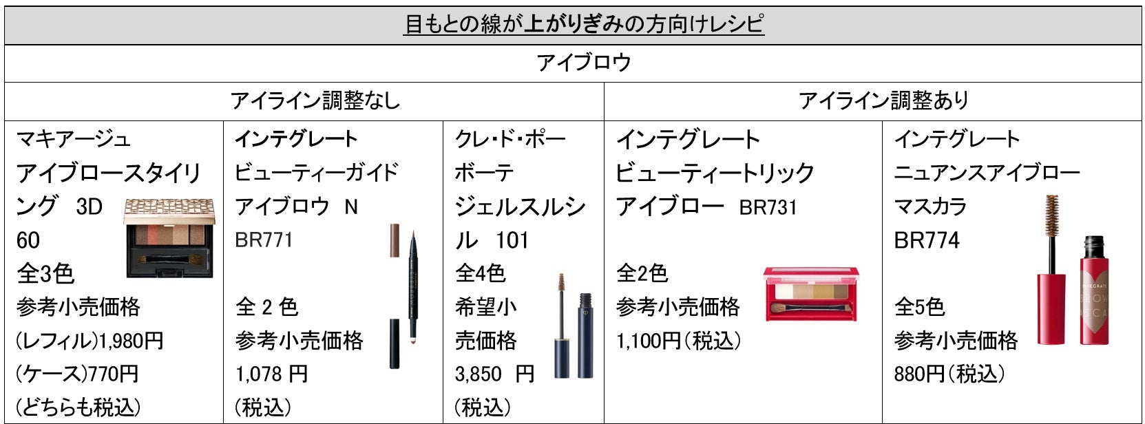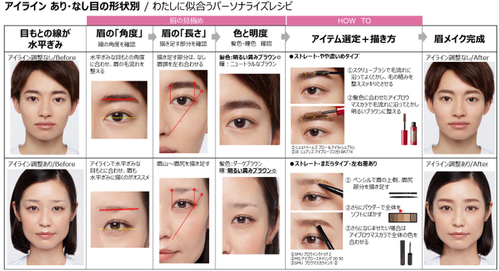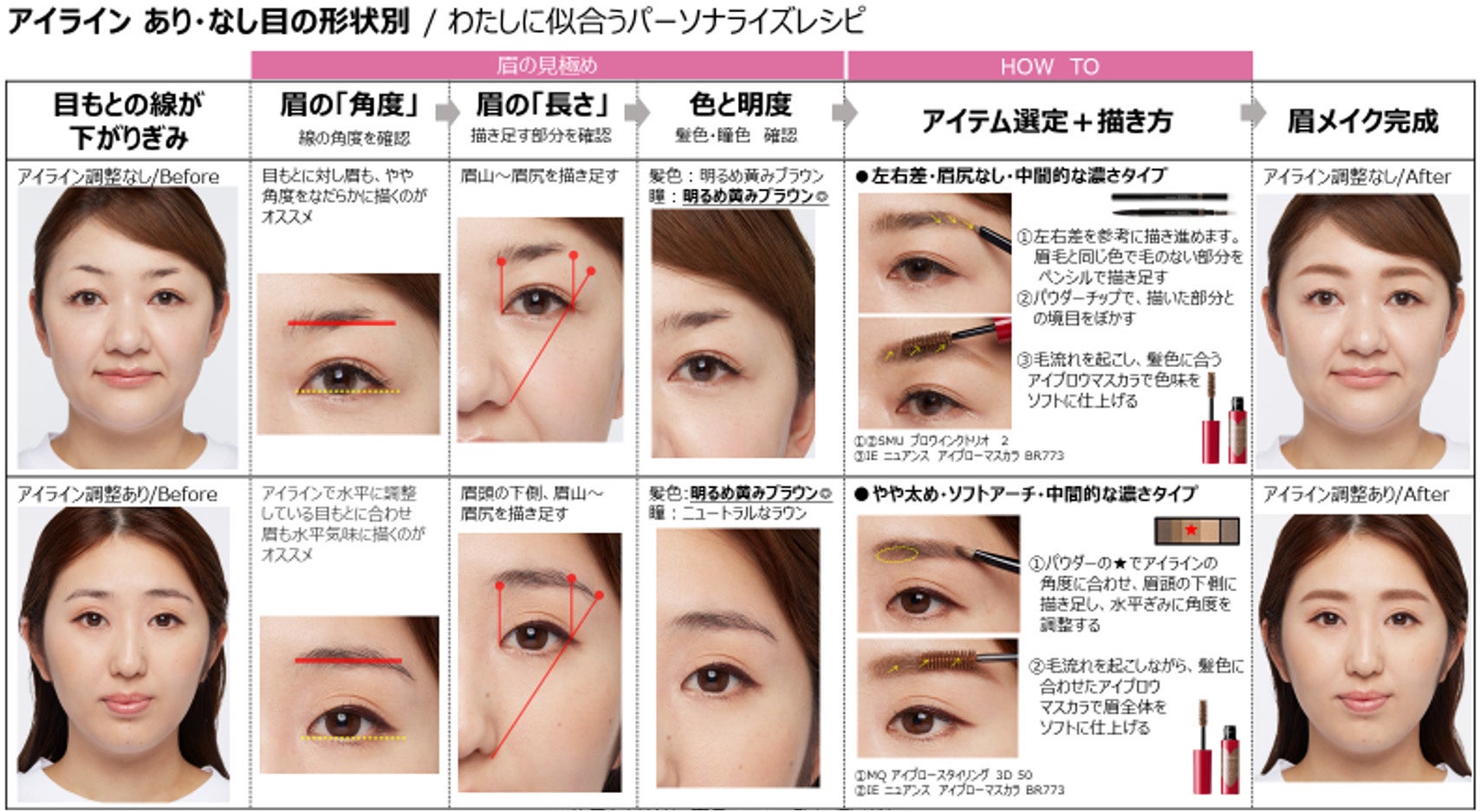 自分に似合う眉のパーソナライズレシピを目もとの線が上がりぎみの方向け、水平ぎみの方向け、下がりぎみの方向けの3つに分けてご紹介します。
