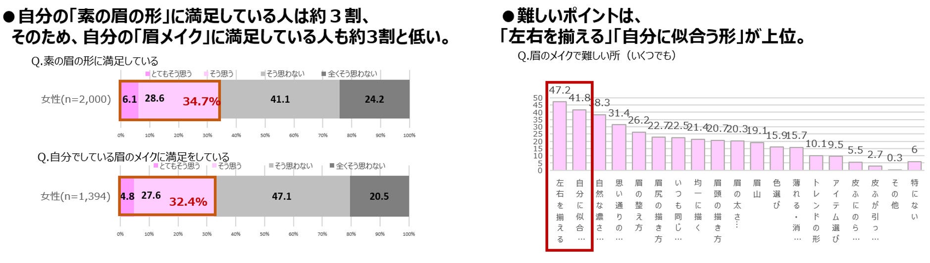そのような市場背景がある一方で、資生堂の眉に関する意識調査※2 によると、自分の「素の眉の形」に満足している人は約3割と自分の「眉」に満足している人の割合が低いことが分かりました。また眉メイクの難しいポイントとして挙げているのは、「左右を揃える」が47%、「自分に似合う形」が41%と上位を占めており、素の眉だけでなく、眉メイクにも悩みを抱えていることが分かりました。