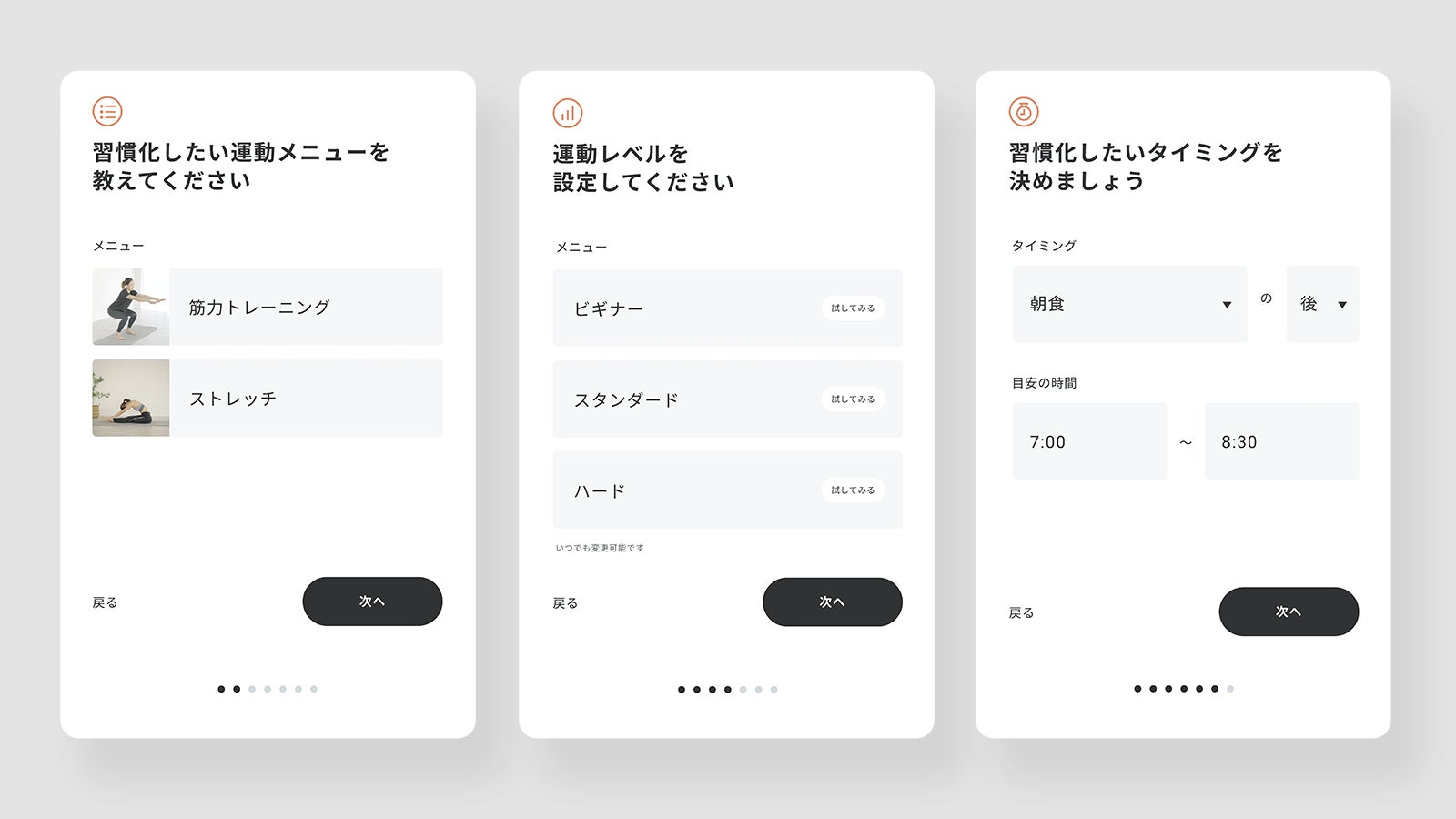 2.運動レベルをビギナー・スタンダード・ハードから選択(筋力トレーニングの場合)