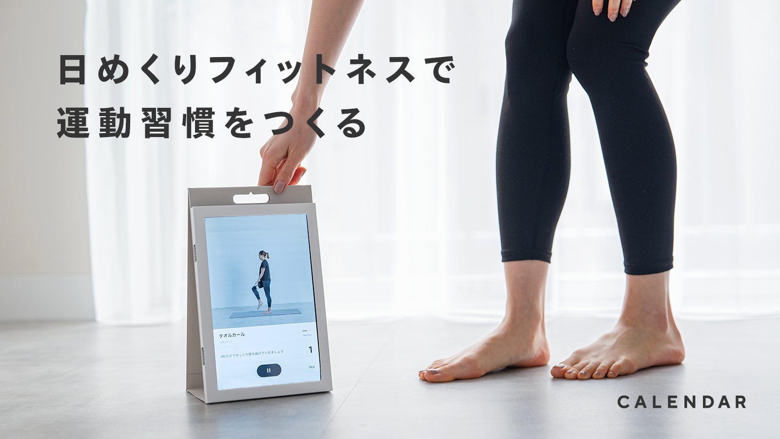 CALENDARはスマート日めくりカレンダー(10.1インチAndroid端末)を使った、習慣化にフォーカスしたオンラインフィットネスサービスです。習慣化しやすいメソッドをサービスに活用しており、育児や在宅勤務などでの運動不足に課題を感じ、日々の運動習慣をつけたい方の在宅での運動習慣づくりをサポートします。
