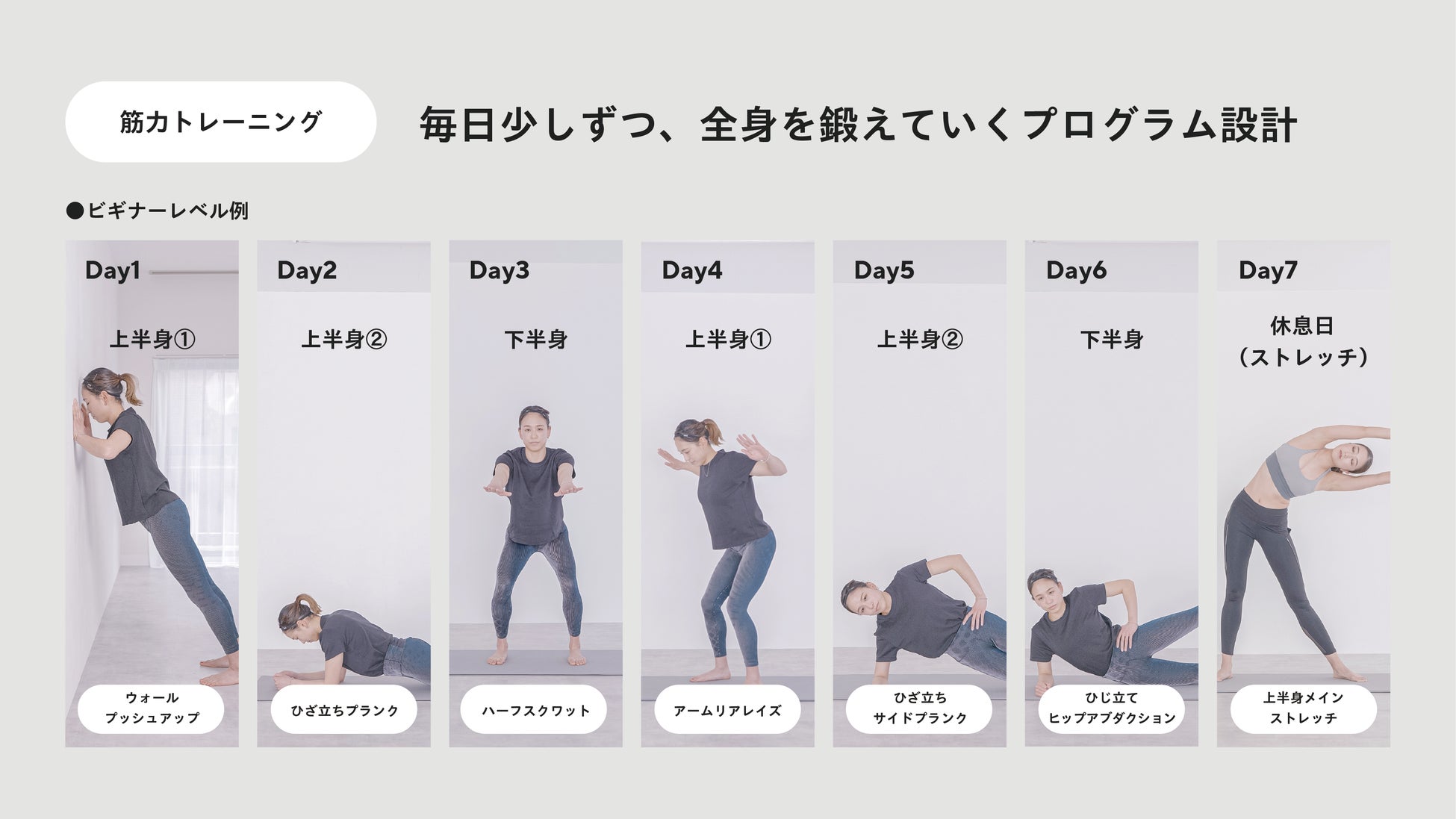 筋力トレーニングの「ビギナーレベル」の1週間のプログラム構成例(週一回の休息日を含む)