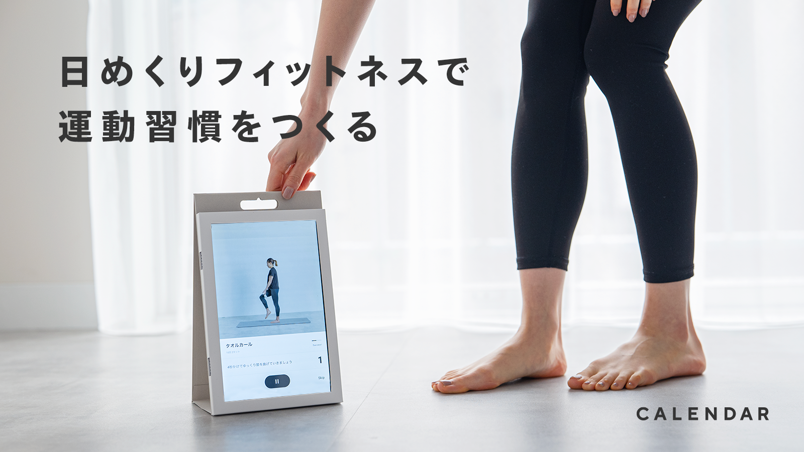 CALENDARはスマート日めくりカレンダー(10.1インチAndroid端末)を使った、習慣化にフォーカスしたオンラインフィットネスサービスです。習慣化しやすいメソッドをサービスに活用しており、育児や在宅勤務などでの運動不足に課題を感じ、日々の運動習慣をつけたい方の在宅での運動習慣づくりをサポートします。