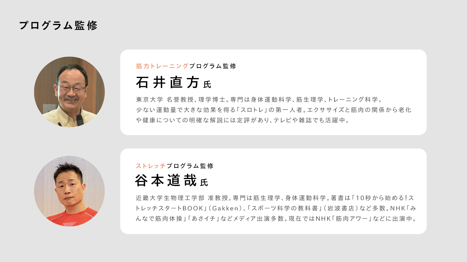 筋力トレーニング研究の第一人者である東京大学の石井直方名誉教授や、NHKのみんなで筋肉体操でおなじみの近畿大学の谷本道哉准教授による監修の、自宅での運動に適した科学的な筋力トレーニングやストレッチプログラムを提供。
