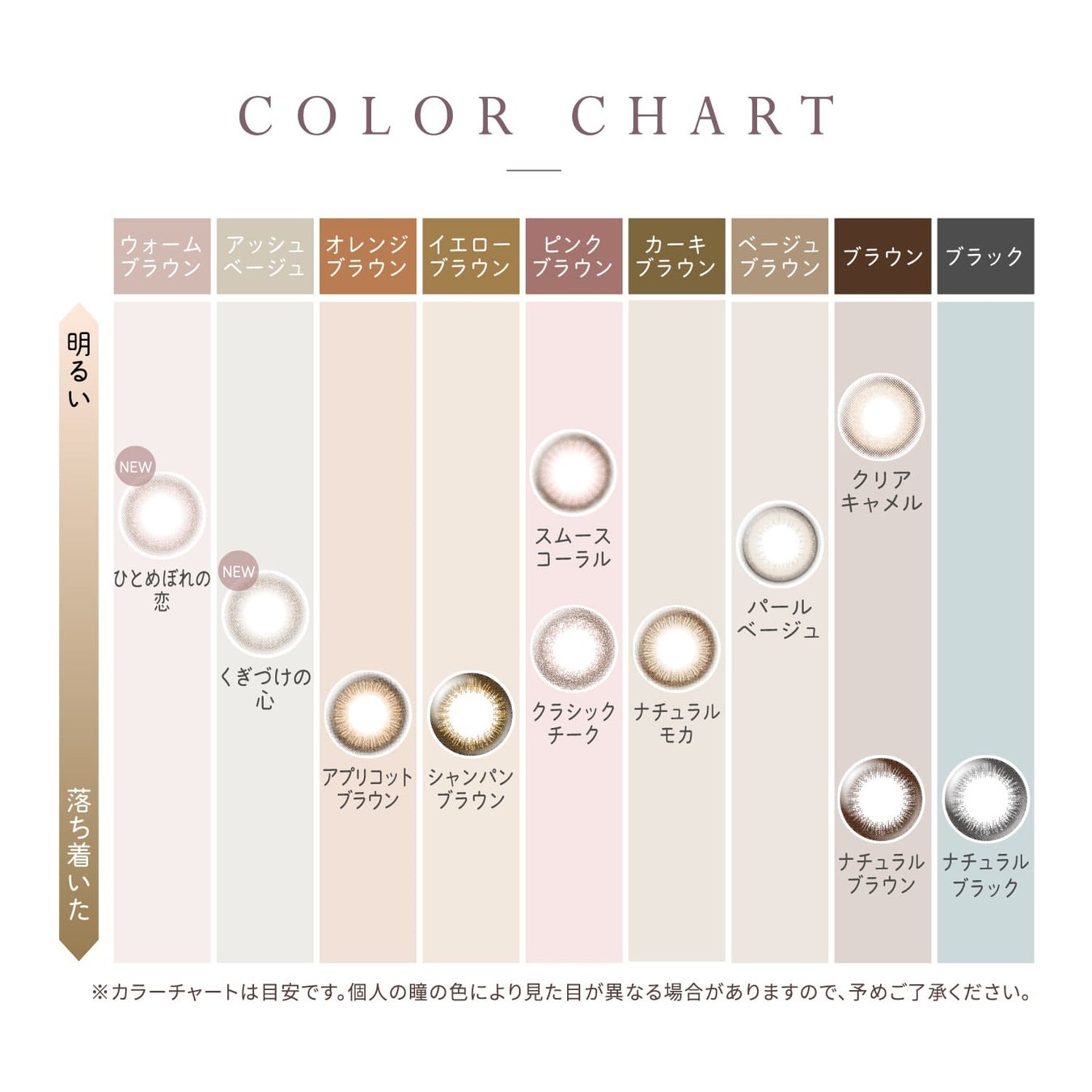 □カラー:ひとめぼれの恋・くぎづけの心・クリアキャメル・パールベージュ・スムースコーラル・ナチュラルモカ・アプリコットブラウン・クラシックチーク・ナチュラルブラウン・シャンパンブラウン・ナチュラルブラック