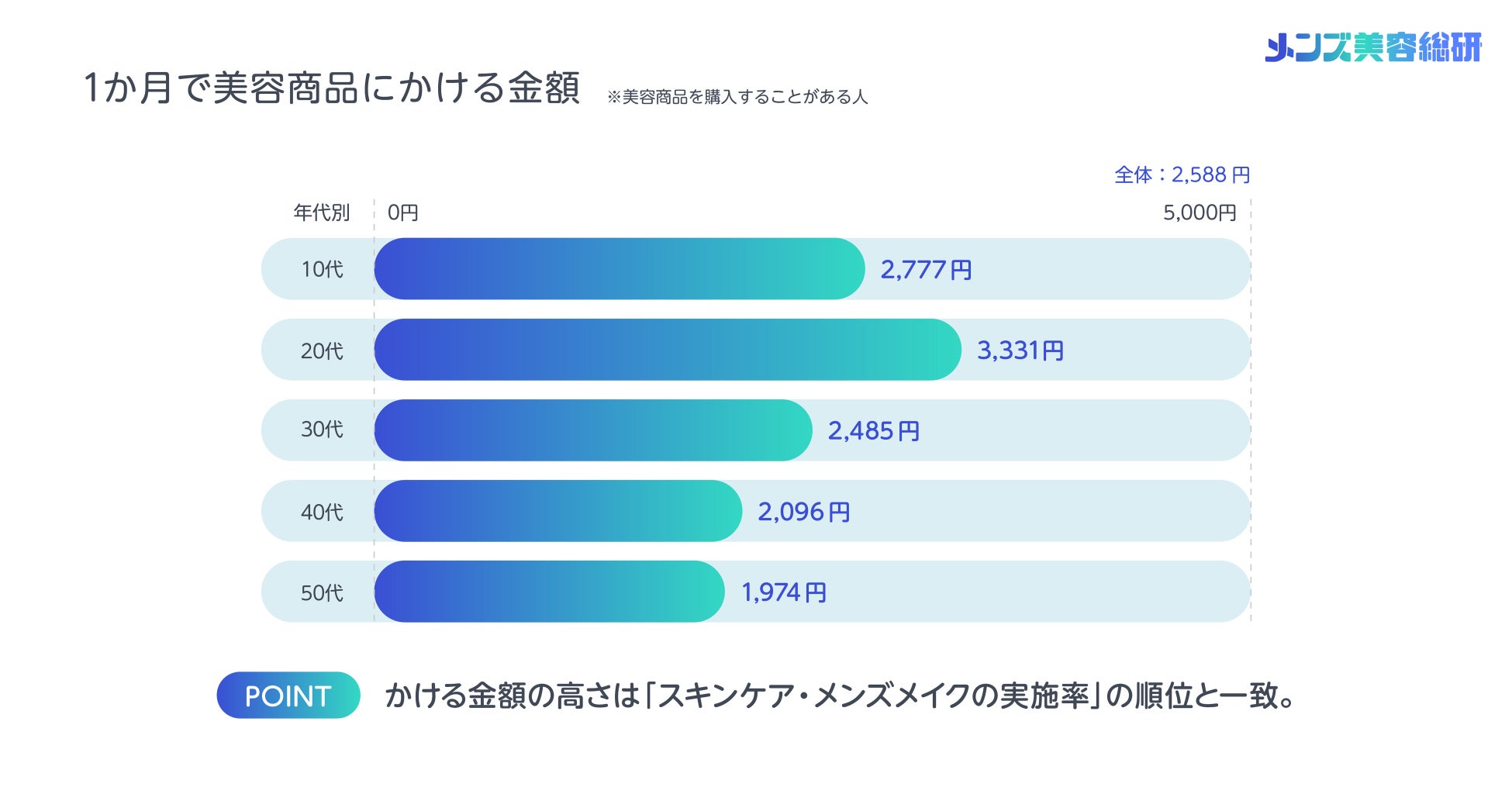 最後に、美容商品を購入することがある方に「毎月、スキンケアアイテムやコスメにどの程度お金をかけているか」を聞いたところ、最もお金をかけているのは20代で平均3,331円、最もお金をかけていないのは50代で平均1,974円、全体の平均は2,588円となりました。