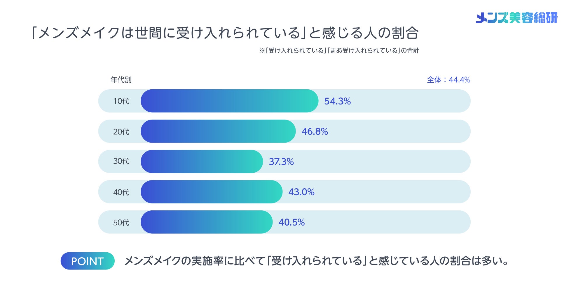 次に、「世間一般的に『男性がメイク(※)すること』は受け入れられていると思うか」という質問では、「受け入れられている」と答えた方は全体で44.4%。最も多かったのは10代で54.3%となりました。10代の男性は、スキンケアやメンズメイクへのハードルの高さを感じていないからこそ、関心も強くなる傾向にあると考えられそうです。一方で「受け入れられている」と答えた方が最も少なかったのは30代で37.3%となりました。40代や50代よりスキンケアやメンズメイクへの関心が強い30代ですが、年上・年下どちらとも接することの多い「中間管理職」のような年代であると考えられ、世代間のギャップを感じる機会も多いのかもしれません。