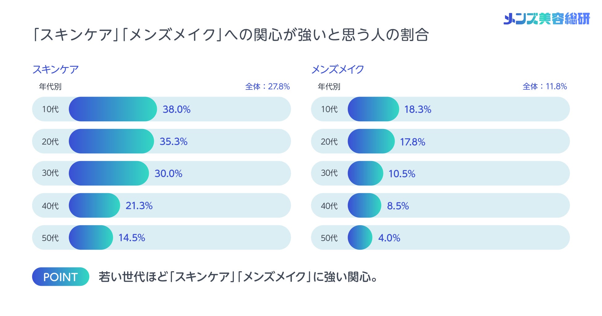 具体的に、「スキンケアへの関心が強い」人の割合は10代:38.0%、20代:35.3%、30代:30.0%、40代:21.3%、50代:14.5%。「メンズメイクへの関心が強い」人の割合は10代:18.3%、20代:17.8%、30代:10.5%、40代:8.5%、50代:4.0%となっています。