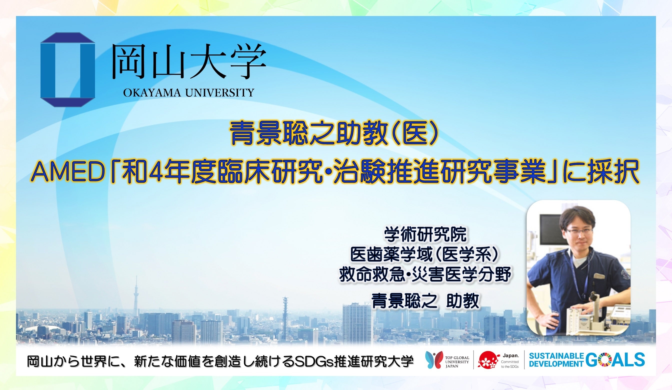 国立大学法人岡山大学(本部:岡山市北区、学長:槇野博史)学術研究院医歯薬学域(医学系)救命救急・災害医学分野の青景聡之助教が、国立研究開発法人日本医療研究開発機構(AMED)の「令和4年度臨床研究・治験推進研究事業」に採択されました。