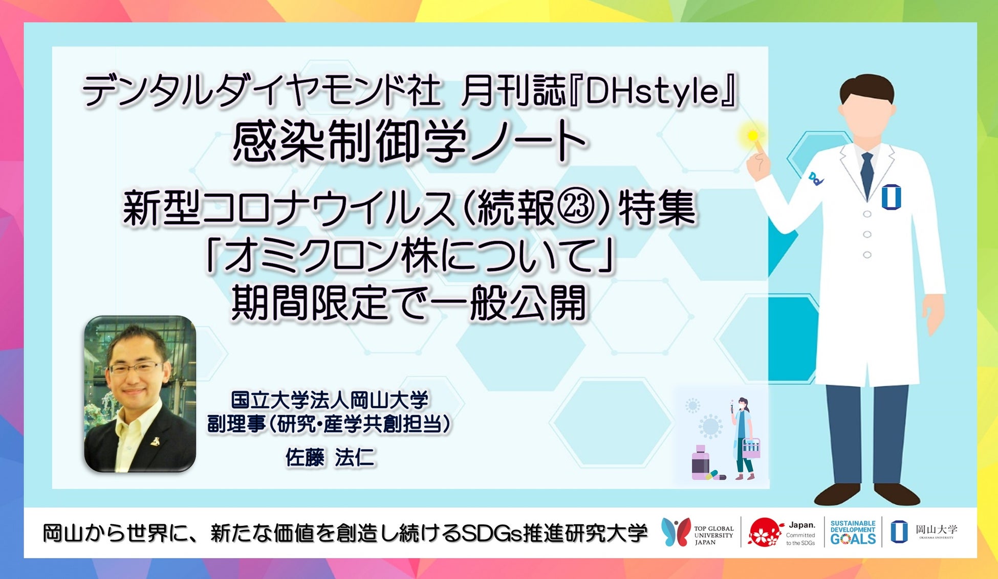 国立大学法人岡山大学(本部:岡山市北区、学長:槇野博史)東京オフィス駐在の佐藤法仁副理事(研究・産学共創担当)・URAは、歯科総合出版社である株式会社デンタルダイヤモンド社(本社:東京都文京区本郷、代表取締役:濵野優)が歯科衛生士向けに発行している月刊誌『DHstyle』に、連載「感染制御学ノート」を2012(平成24)年1月から行っています。