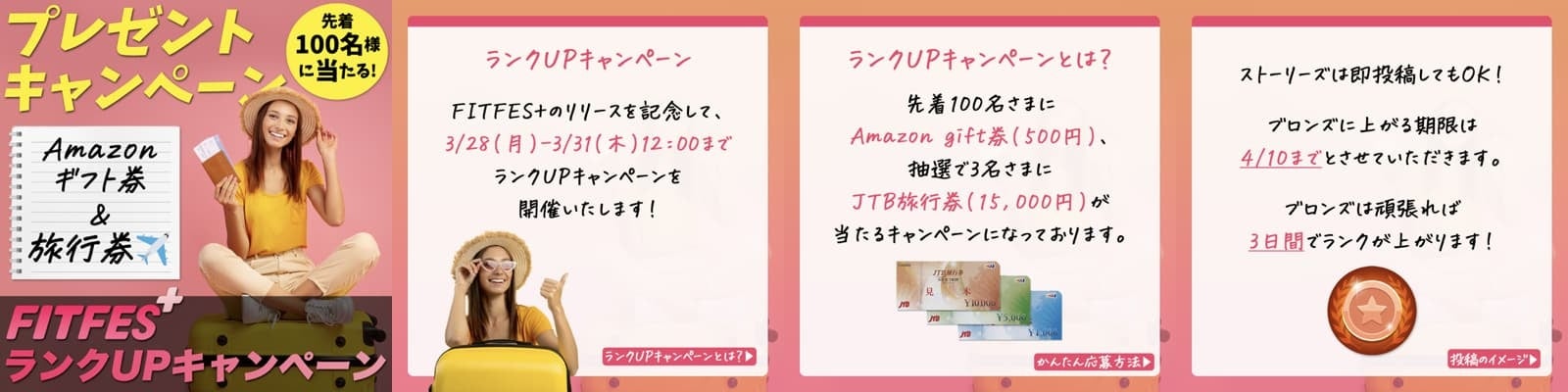 現在FITFES+では、リリースを記念して、ランクを一つあげた方を対象に豪華プレゼントキャンペーンを実施中です。ランクは運動や食事報告のミッションをクリアすることで上がります。この機会にぜひダイエットに挑戦し、豪華プレゼントもGETしてください。