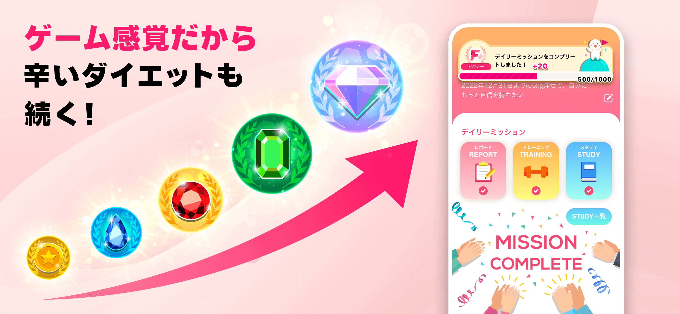 - 辛いダイエットもゲーム感覚で楽しく続けていただけるよう、課題をクリアするごとにランクUPしていく「ランクUP機能」を導入しました。
