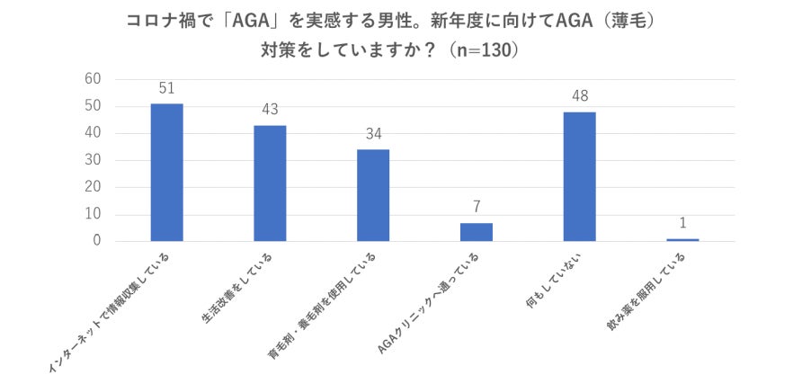 続けて同じ130人に対して、『新年度に向けてどんなAGA(薄毛)対策・対応をしていますか?』と質問したところ、「インターネットで情報収集している」が39.2%(51人)、「生活改善をしている」が33.1%(43人)、「育毛剤・養毛剤を使用している」が26.2%(34人)、「AGAクリニックへ通っている」が5.4%(7人)、そして「何もしていない」が36.9%(48人)という結果となりました。4月、新年度を迎えるにあたり「身だしなみ」を気にする時期です。抜け毛が増えたと感じていても、そのうち約4割の男性は「何も対策はしていない」という背景に「対策をしないという事は、そこまで気にするものでもない、という理由もあるのと、抜け毛要因の仮説と逆説的ですが、テレワークにより直接人と会う必要がないという背景もあるかもしれません」(NOFATE代表・水野和樹)と感じています。