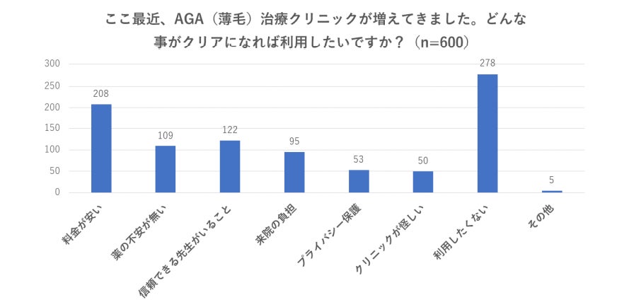 最後に、『コロナ禍で「私、ちょっと老けたかも」と感じることはありますか?』という質問に対して、「はい、あります」と回答した204人に対して、『AGA(薄毛)治療クリニックへ通ってみたいと思いますか?』という質問したところ、「はい、思います」が36%(73人)、「いいえ、思いません」が40%(81人)、「どちらもでない」が24%(50人)という結果となりました。自身「老けた」と実感ある男性の約4割がAGA治療に興味を持っていることが分かります。「AGA治療が徐々に認知されてきた結果と言えます。しかし私も20代前半からAGAで悩みました。そして100万円も超えるコストが発生しました。働き世代にとって、AGA治療が高額です」(NOFATE代表・水野和樹)と、まだまだコストの面でも課題が多いと感じています。そこで続けて600人全員に対いて『ここ最近、AGA(薄毛)治療クリニックが増えてきました。どんな事がクリアになれば利用したいですか?』と質問したところ、「利用したくない」が46.3%(278人)ではありますが、それを除く1位が「料金が安い」で34.7%(208人)、2位が「信頼できる先生がいること」で20.3%(122人)、3位が「薬の不安が無い」で18.2%(109人)という結果となりました。代表の水野がNOFATEサービスを立ち上げる切欠となった「料金の安さ」そして「安心して相談できる先生がいること」が上位に来る結果であり「AGA治療は継続性が大事なので、料金が安くないと治療を続けることはできません。時代にあったAGA治療がこれからは求められる」(NOFATE代表・水野和樹)と感じています。