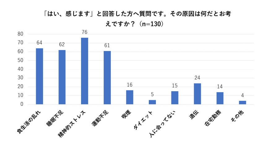 続けて『「はい、感じます」と回答した方へ質問です。その原因は何だとお考えですか?(複数回答可)』と質問したところ、1位が「精神的ストレス」で58.5%(76人)、2位が「食生活の乱れ」で49.2%(64人)、3位が「睡眠不足」で47.7%(62人)、4位が「運動不足」で46.9%(61人)、5位が「遺伝」で18.5%(24人)という結果となりました。「AGAの原因の多くは遺伝が関係するものの、ストレスや食生活、睡眠不足も影響を及ぼします。1位がストレスで、半数を超えている状況をみると、コロナによる生活環境の変化が少なからず薄毛への影響を与えているかもしれません。この影響度については、より詳細なデータを収集していく必要がありそうです」(NOFATE代表・水野和樹)。