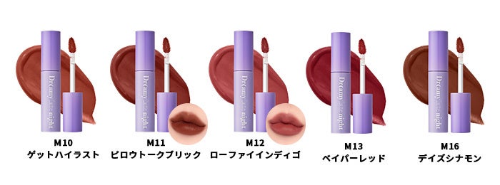 「バイト ザ ビート メロウティント」の人気に伴い、メロウティントをご愛用いただいている方から多く寄せられた「どんな肌トーンにも似合うカラーが欲しい」というカラーに関するご要望を受け、誕生した「ドリーミー レイト ナイト メロウティント」。発売と同時に多くの期待と人気を得て、肌トーンがイエローベースの方もブルーべースの方も手に取りやすい、多彩なカラーバリエーションを誇っています。「幻想的な空間と、感性あふれる夜」というコンセプトの「ドリーミーレイトナイトメロウティント」はクラシックなブリックカラーの<M11. ピロウトークブリック>と、 ブルーべースの方に絶大な人気のある<M12.ローファイインディゴ>が代表カラーです。