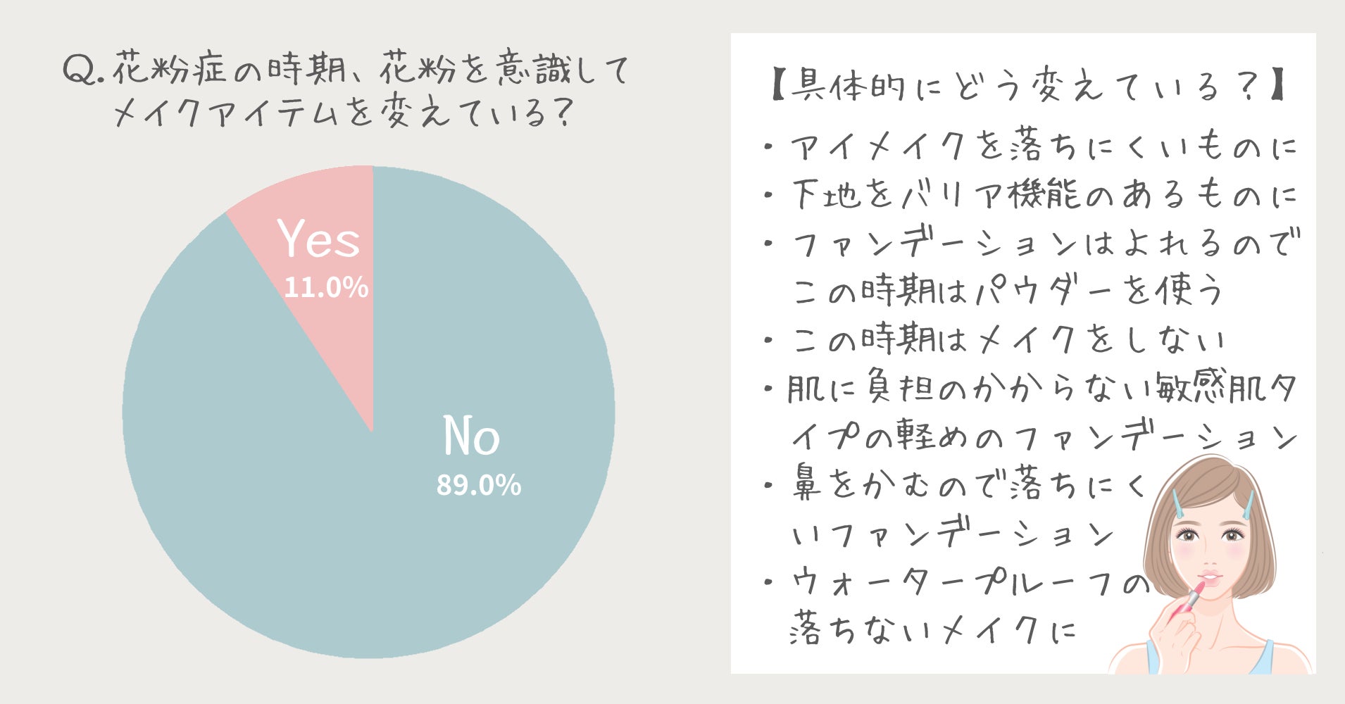 実際、花粉症のこの時期は肌のコンディションからスキンケアアイテムをいつもと違うものに変えているという女性は17.0%。